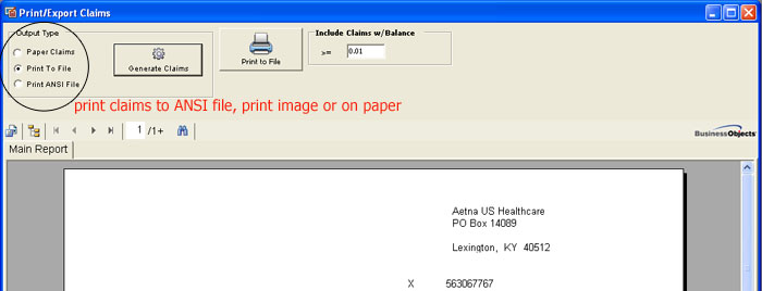 This is the main screen for adding a new batch of claims for processing. You can choose to file on paper or electronically. No other software allows you to filter claims for processing like MedOffice – you can select to batch claims by billing #, dates, type of insurance, and numerous other filters shown on the bottom tabs.